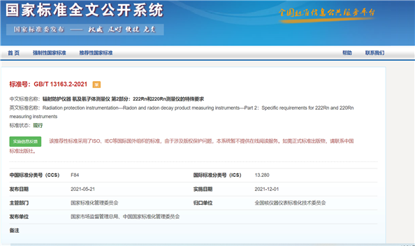 近日,由中廣核久源公司牽頭修定的國家標準《輻射防護儀器氡及氡子體測量儀第2部分:222Rn和220Rn測量儀的特殊要求》GB/T13163.2-2021,經(jīng)國家市場監(jiān)督管理總局、中國國家標準化管理委員會于2021年5月21日批準發(fā)布生效,于2021年12月1日正式實施。